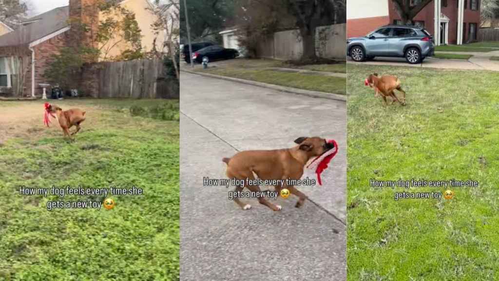 The text overlay perfectly sums up her mood: “How my dog feels every time she gets a new toy.” And from the very first second, it’s clear this isn’t a quiet moment of appreciation, it’s a full-scale event. In the video, the dog runs, as if the excitement cannot stay contained in one place.