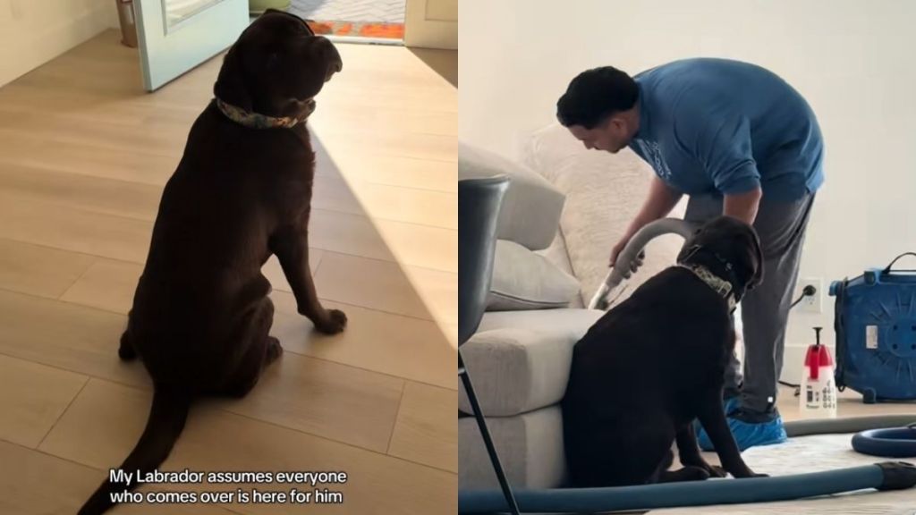 The video of the Labrador Retriever has over 1000 likes for good reason. Woody takes his job on the welcoming committee seriously. For him, every visitor is just a friend he hasn’t met yet. He stays relaxed while the crew works in the background.