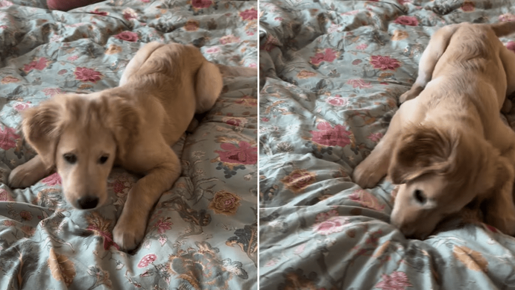 Puddle’s curiosity and energy are understandable. Puppies explore the world with their mouths and paws, and a moving blanket would naturally feed into their chase-and-pounce instinct — and so, for the Golden Retriever puppy in the video, the bedsheet basically turns the bed into an exciting game arena.